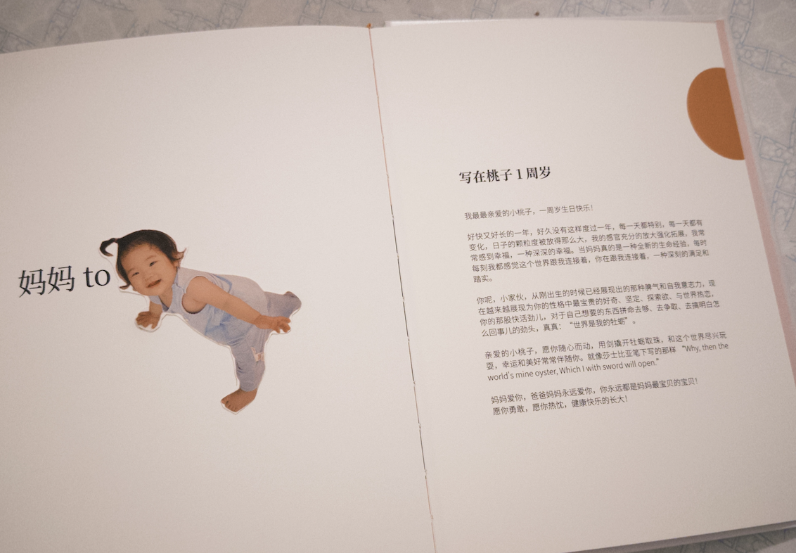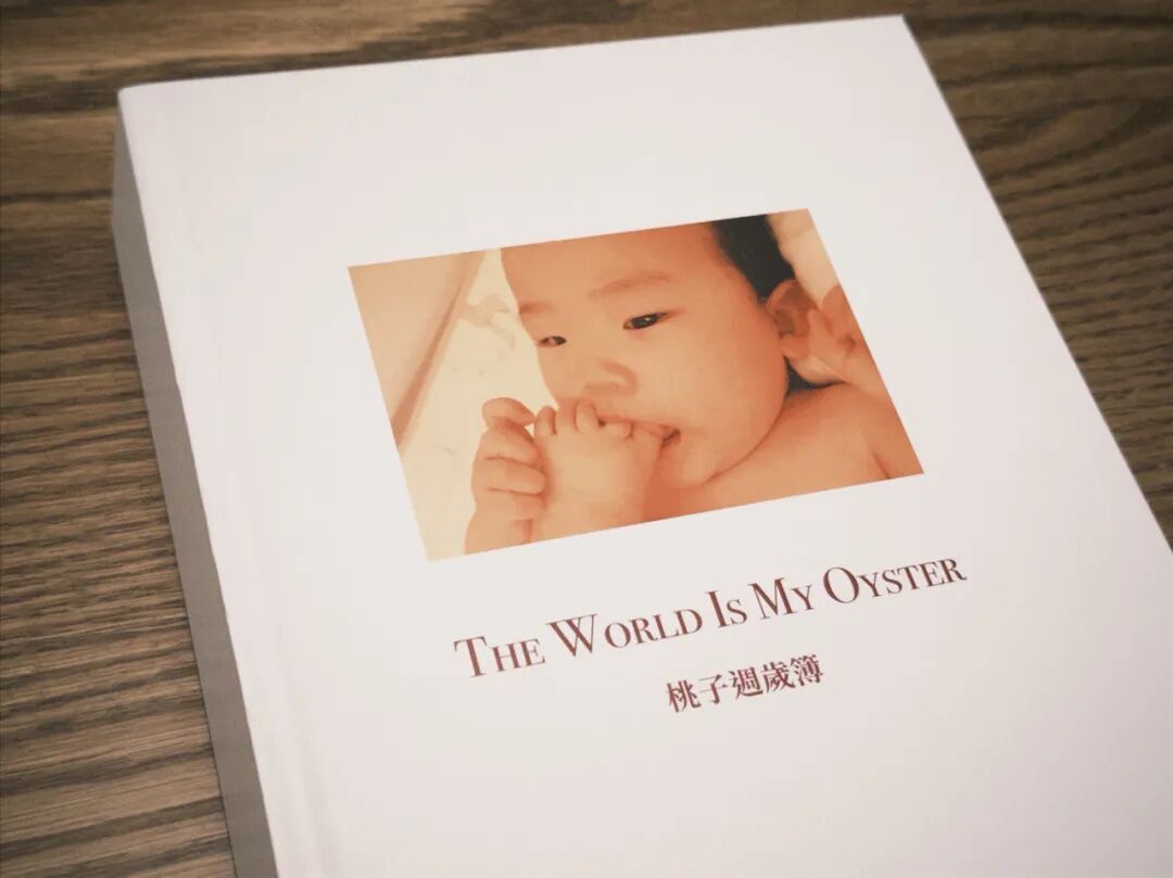 传承我们家优良传统,我也给桃子做了一本《桃子周岁簿》。现学 indeisgn 每晚在桃子睡觉以后深夜挑灯2个月,把这一年点滴日记和照片都整理出来,做了300页的大厚书,这本应该叫“桃子bible”,安顿她最早期生命的探索。“the world is my oyster” 来自莎士比亚,寓意“随心而动,这个世界是你的,去做任何你想做的事,人生所有的可能性都向你敞开”。宝宝这一年就是用这样超强的探索欲,和世界热恋。